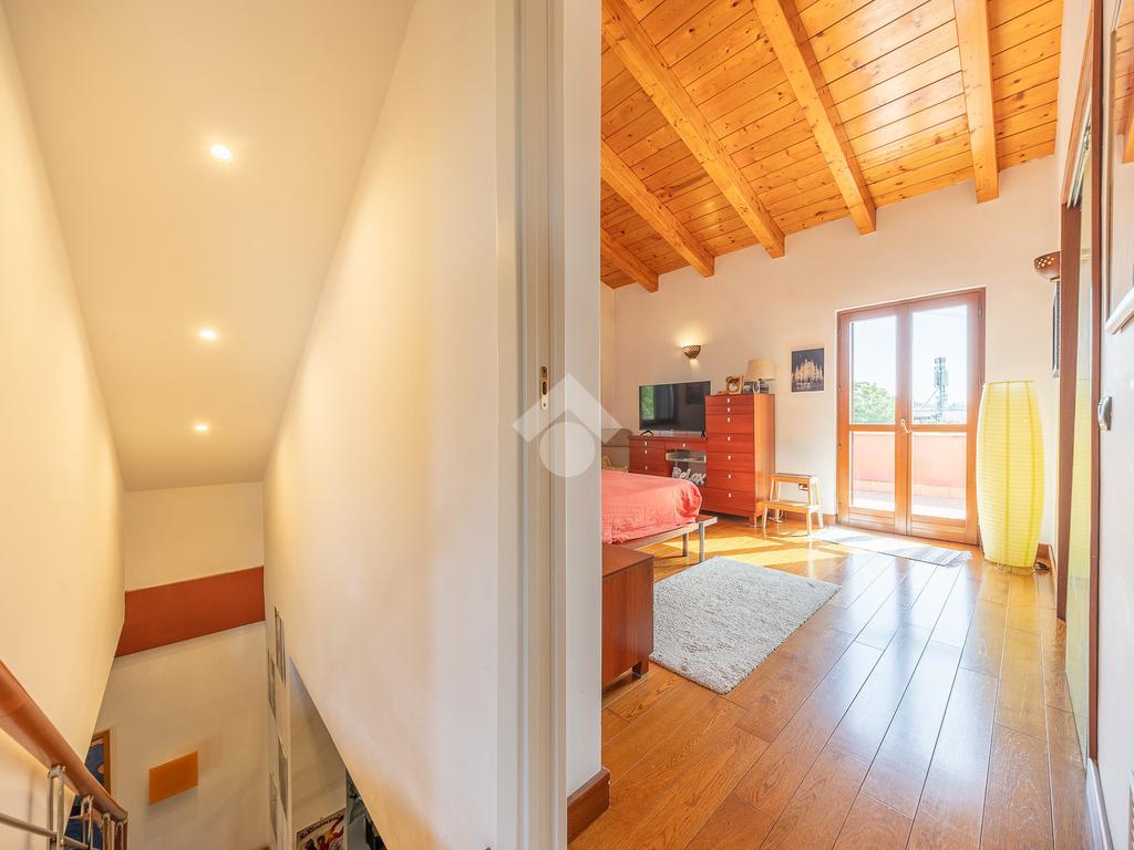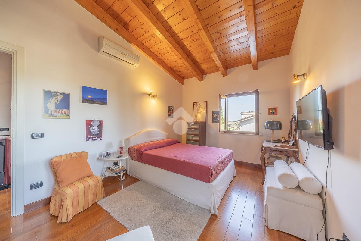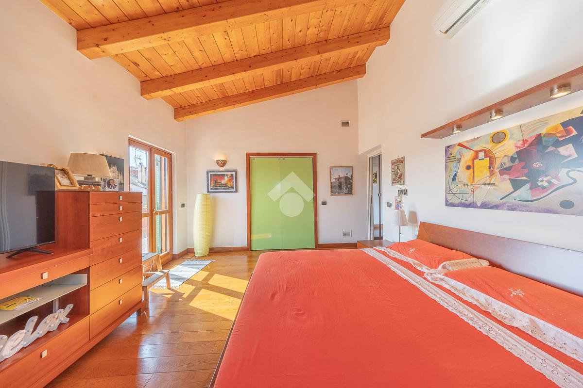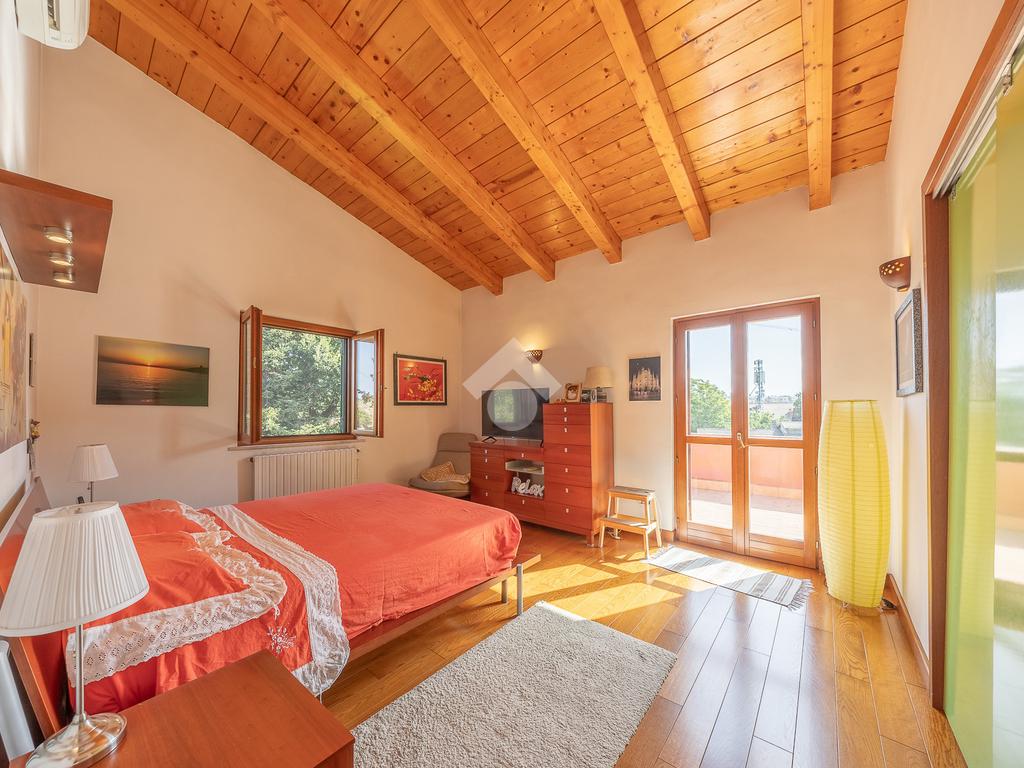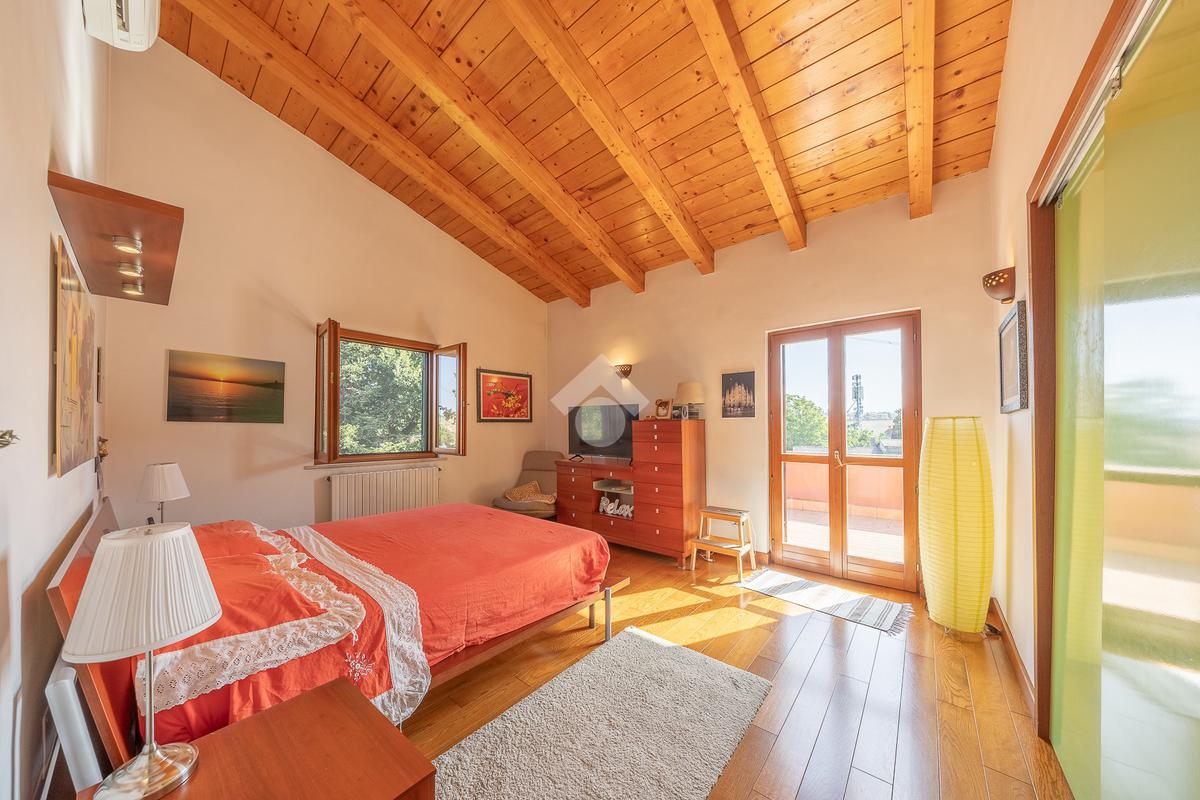Percorrendo la scala interna rifinita in legno, ci troviamo nella zona notte, dove il disimpegno conduce in una delle prime camere da letto. Ampia e luminosa, la camera è caratterizzata da travi a vista e pavimento in legno. L'ambiente presenta due finestre, una delle quali realizzata per consentire l'uscita sul grande terrazzo semi perimetrale. La camera inoltre presenta una comoda cabina armadio al suo interno.