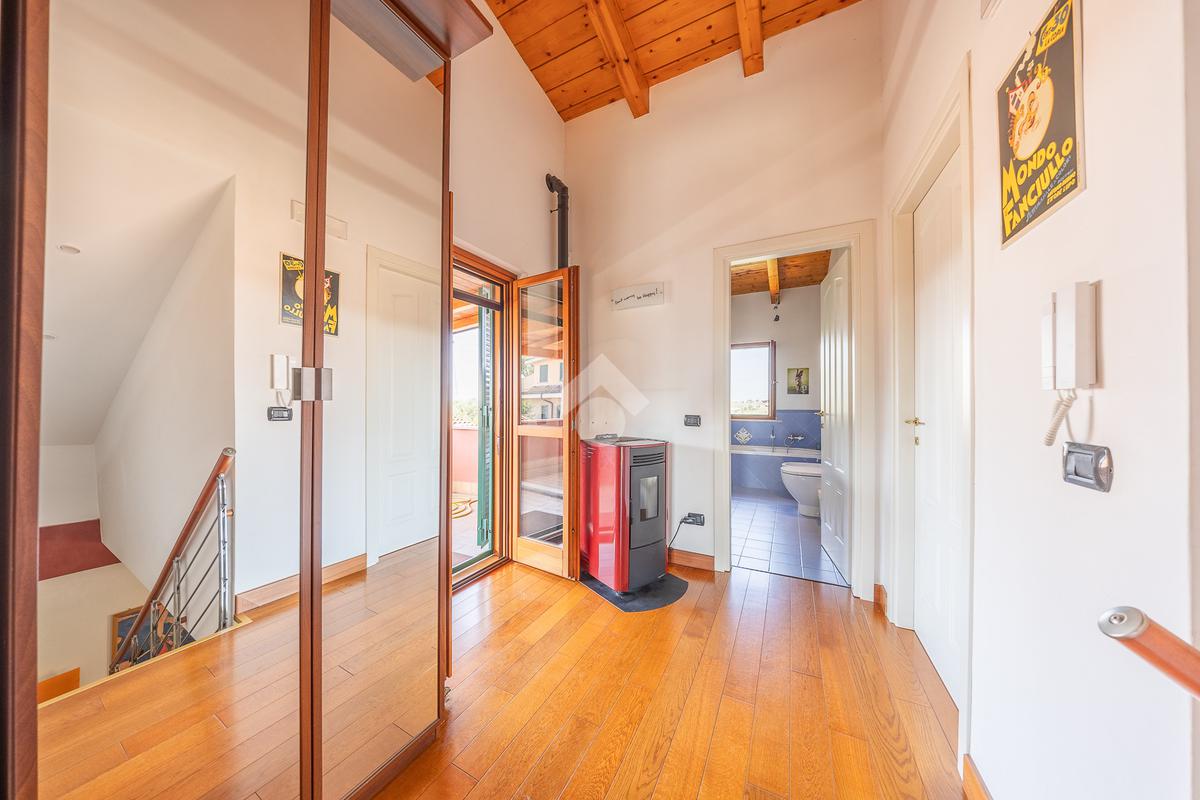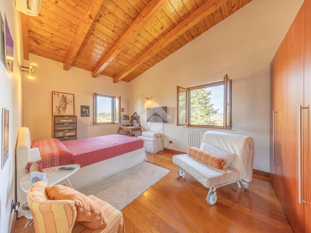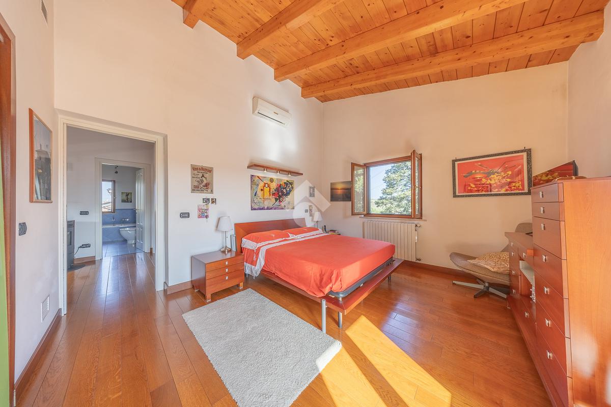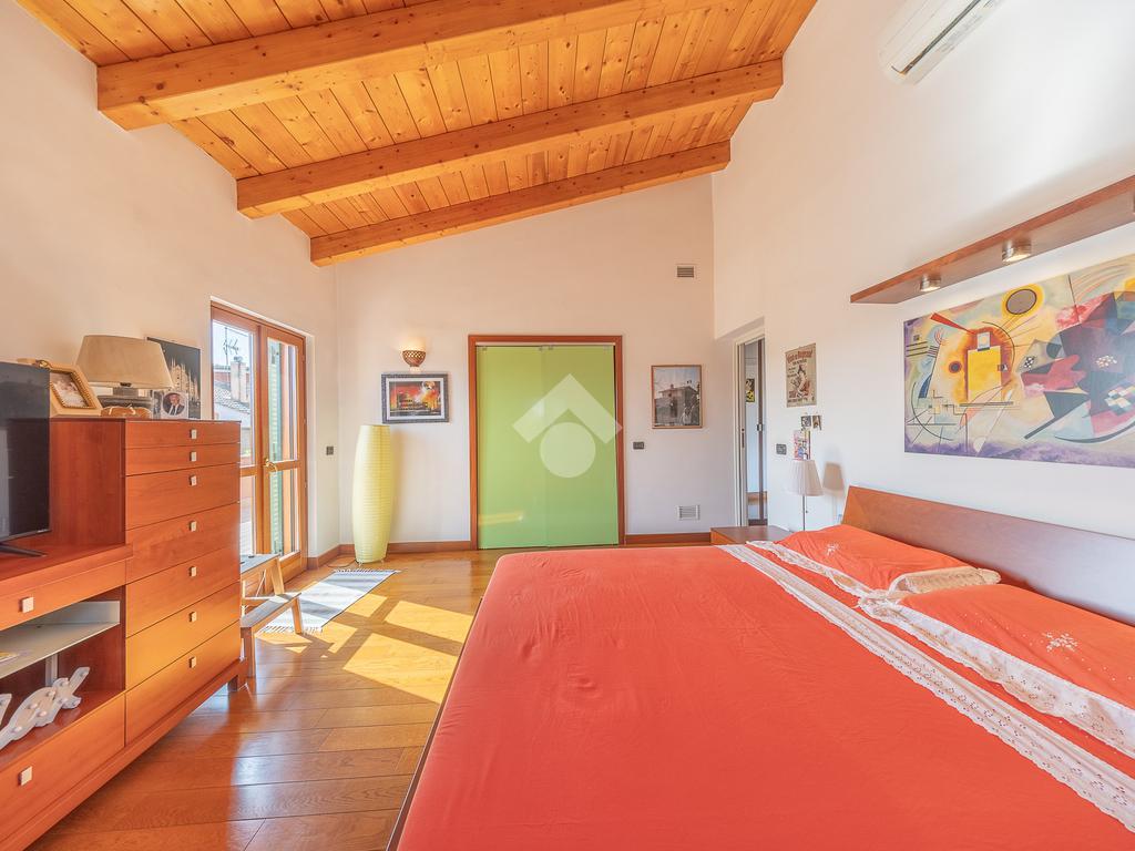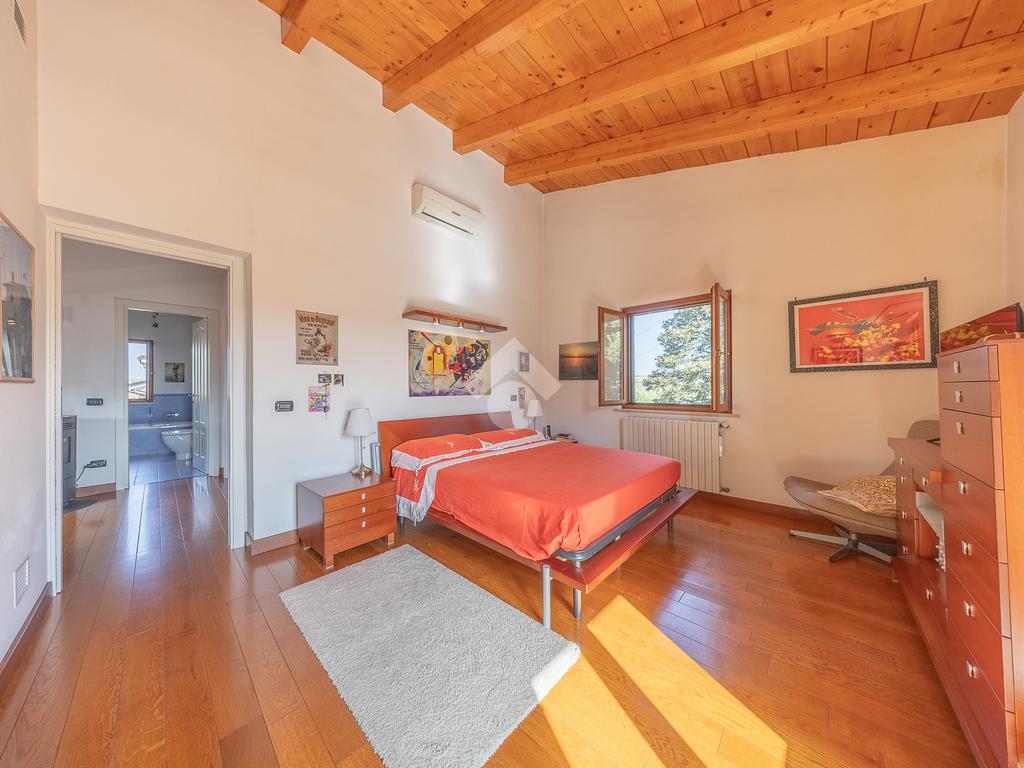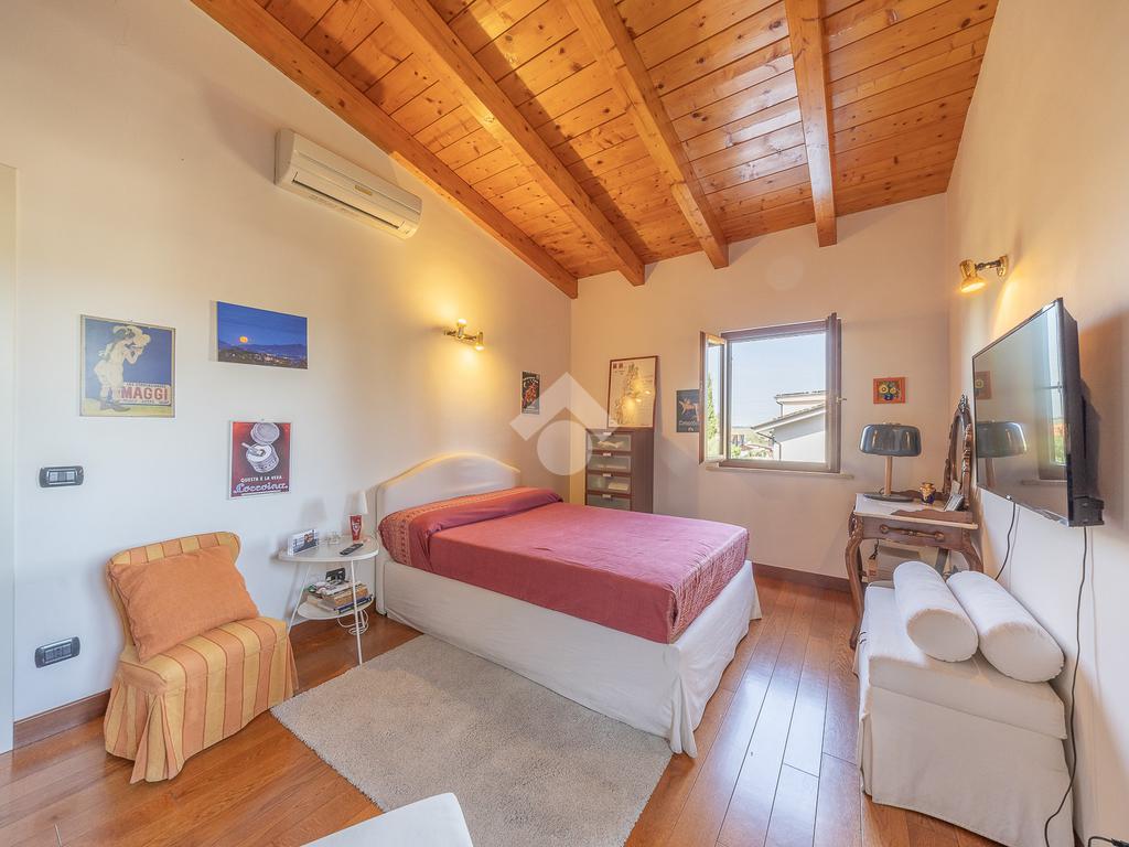 Percorrendo la scala interna rifinita in legno, ci troviamo nella zona notte, dove il disimpegno conduce in una delle prime camere da letto. Ampia e luminosa, la camera è caratterizzata da travi a vista e pavimento in legno. L'ambiente presenta due finestre, una delle quali realizzata per consentire l'uscita sul grande terrazzo semi perimetrale. La camera inoltre presenta una comoda cabina armadio al suo interno.