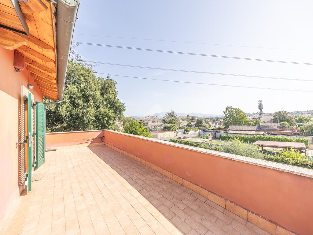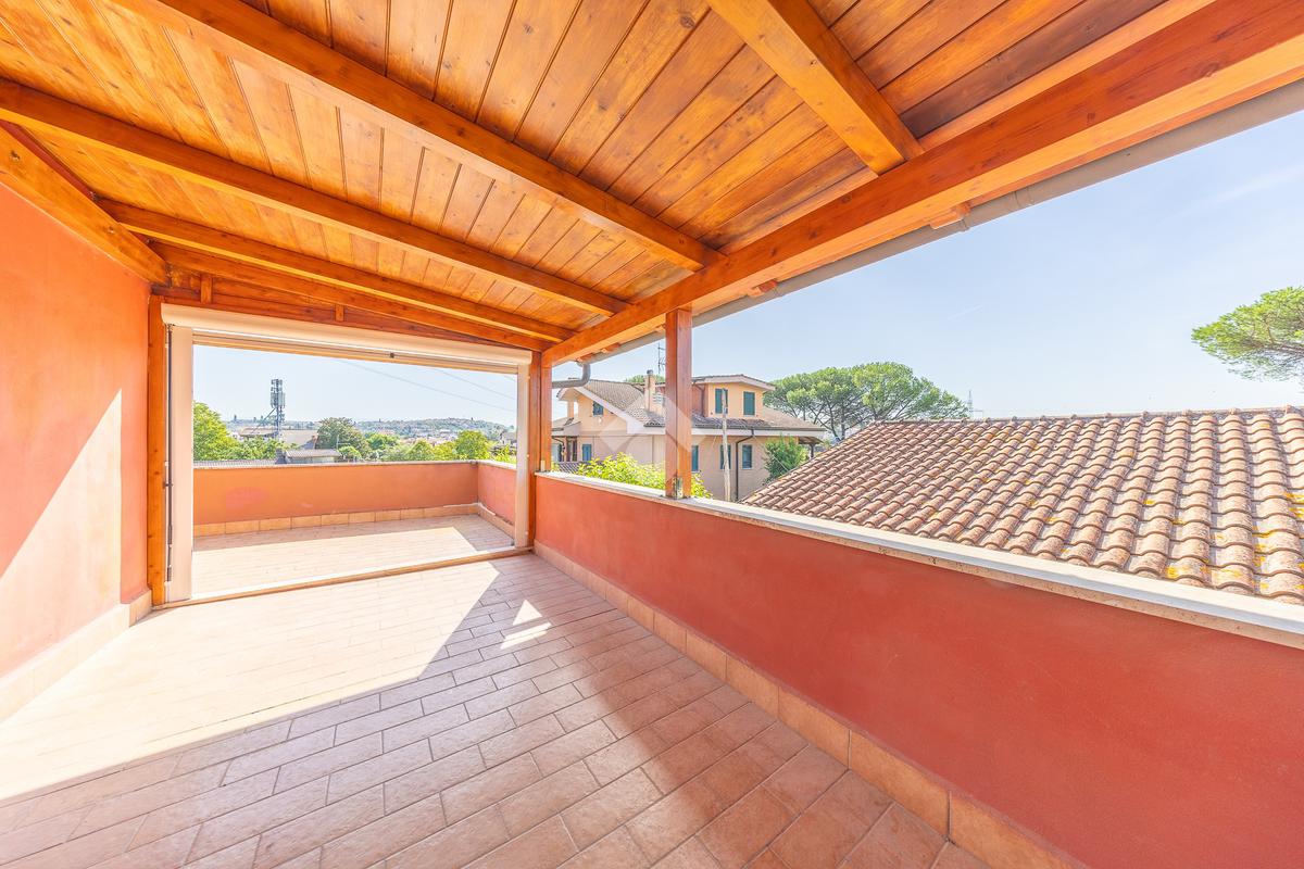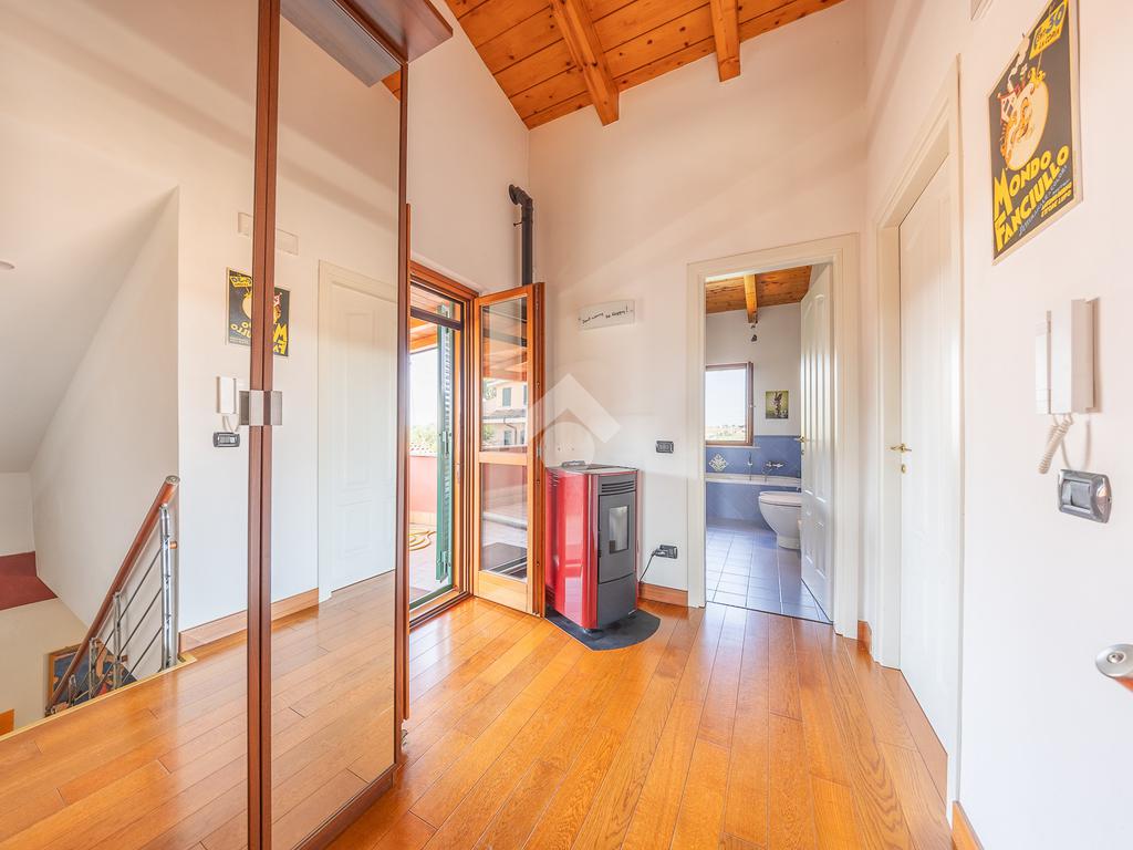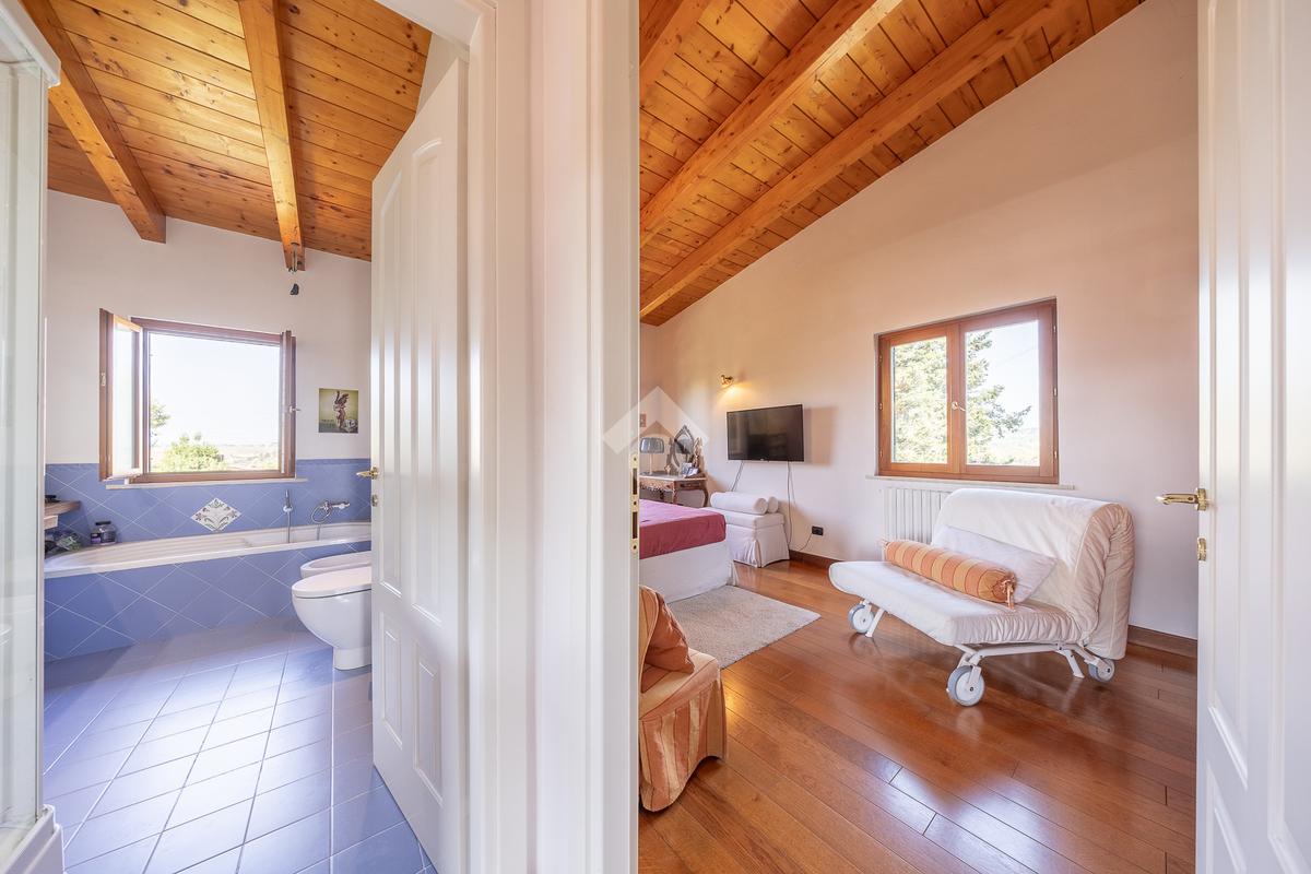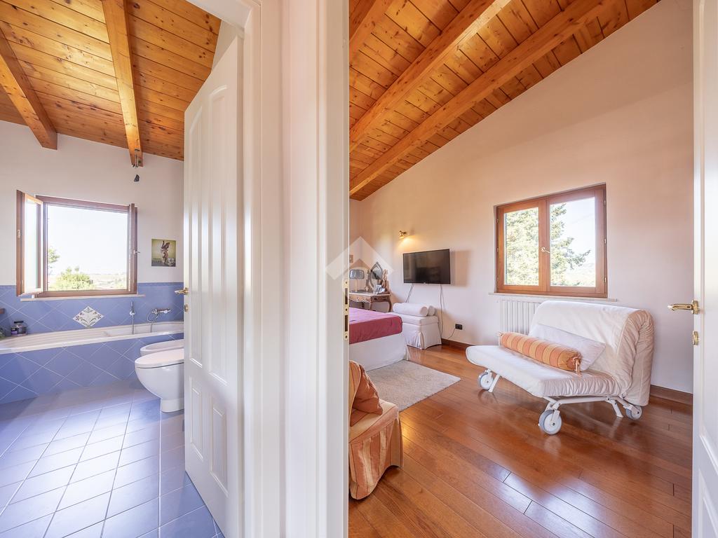 Percorrendo la scala interna rifinita in legno, ci troviamo nella zona notte, dove il disimpegno conduce in una delle prime camere da letto. Ampia e luminosa, la camera è caratterizzata da travi a vista e pavimento in legno. L'ambiente presenta due finestre, una delle quali realizzata per consentire l'uscita sul grande terrazzo semi perimetrale. La camera inoltre presenta una comoda cabina armadio al suo interno.