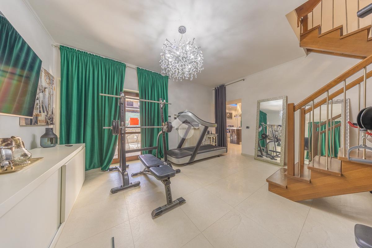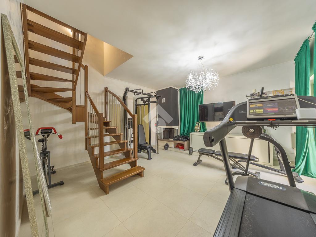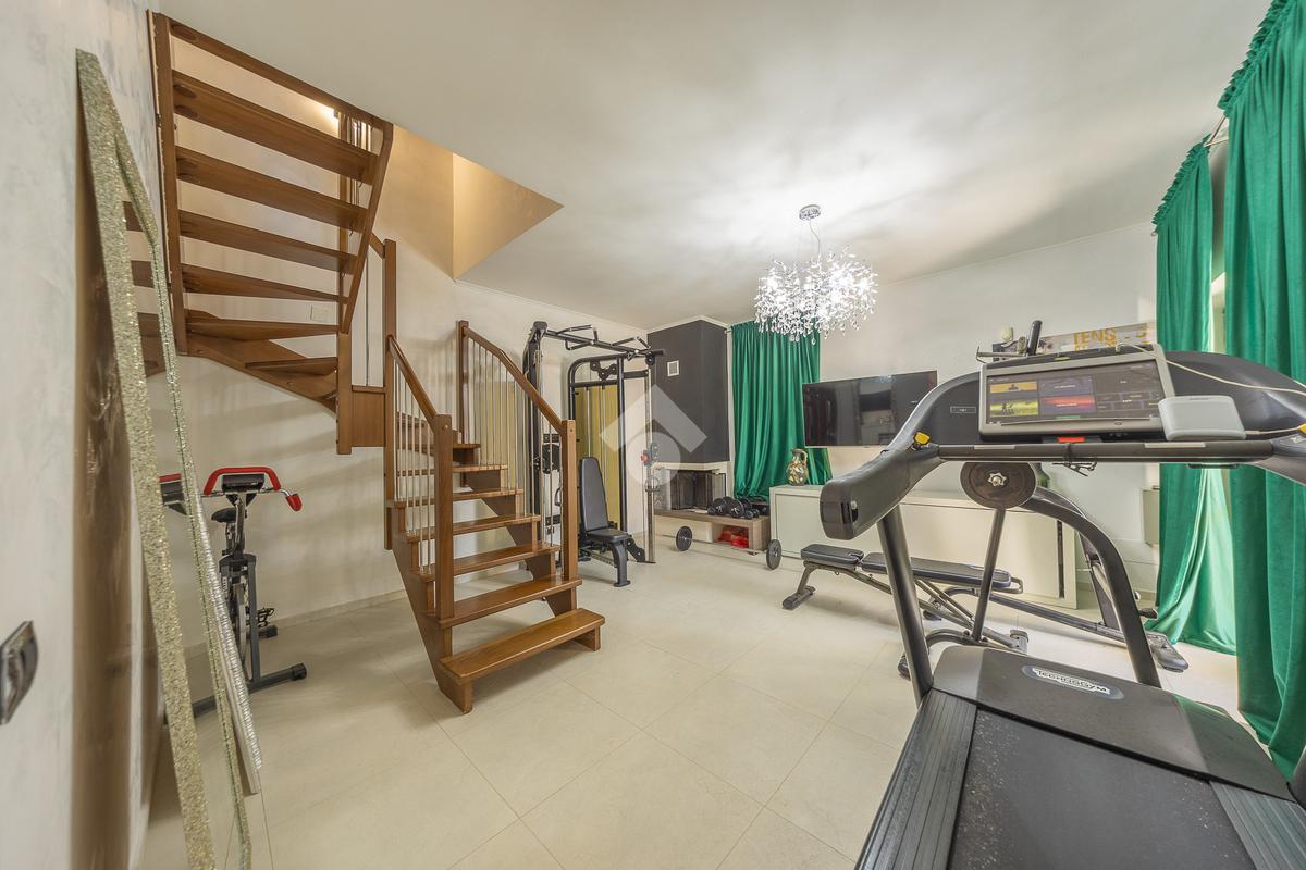 Il piano seminterrato, parzialmente fuori terra, comprende invece una seconda zona giorno con cucina a vista, un altro ambiente particolarmente versatile (attualmente adibito a palestra) ed un terzo ed ultimo bagno. Grazie alla presenza di una comoda porta finestra situata proprio in cucina, è possibile accedere alla corte esterna ed affacciarsi direttamente sul portico con l'intera visuale della piscina.